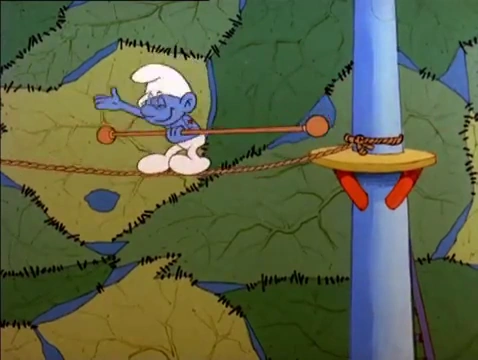 While the circus continues on with the performances, Hefty summons Papa Smurf to talk to him in private, and so Papa Smurf leaves Baby alone so he could find out what's wrong. Hefty confesses that he's now afraid of heights and that he feels like a coward. Papa Smurf says that's nothing to be ashamed of because every Smurf has something that they're afraid of, but he tells Hefty that he must decide what's important to him and to have a little faith in himself. Hefty realizes that Papa Smurf is right and that he can't ruin Baby's circus by not appearing on the high wire like he was supposed to. As he steels himself up for the tightrope act, Baby Smurf wanders off and goes into the cannon which Handy prepares for the grand finale.