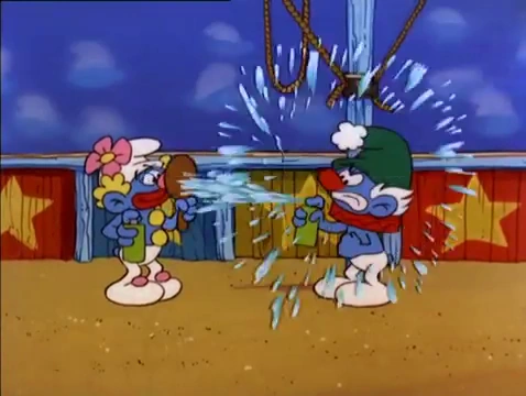 Then comes the main event, in which the Smurfs watch inside the tent the acts introduced by Brainy, who just can't seem to get past his introductions without prompting from the audience. The first act was Smurfette riding on top of two squirrels while standing up and then jumping through a hoop Handy was holding, which made the Smurfs cheer. The second act was Nat Smurf taming a trio of chipmunks, which also elicited cheers from the crowd. Then Brainy turns to Hefty to get him to do his tightrope act, but Hefty is acting uncharacteristically fearful and tells Brainy to have Jokey and Clumsy go next, and as Brainy goes to introduce the third act, Hefty takes a look at the tightrope and finds himself getting dizzy from the sight of it. The next act has Jokey, Clumsy, Farmer, Vanity, and Grouchy dress up as clowns, with Jokey and Clumsy doing juggling, Farmer balancing himself on a rolling rutabaga, and Vanity spritzing water in Grouchy's face.