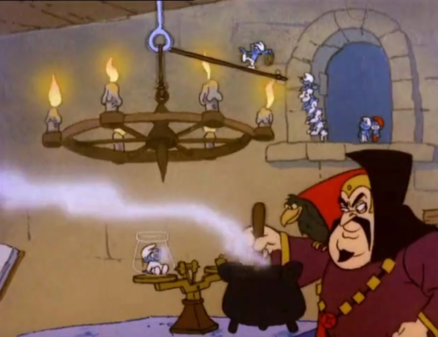 Soon, they reach the window to the sorcerer's laboratory, where he is busy preparing to give Baby Smurf a "hot bath". Papa Smurf sees a chandelier hanging on a rope and tells his little Smurfs that he needs sometime to walk on the rope to the top of the chandelier and then lower himself down to save Baby Smurf. Hefty has a feeling that he's being called upon to do that very job and tries to ask someone else to do it, but Papa Smurf says that he's the only one who's able to do it. Brainy says that Hefty is too afraid to do it, but Hefty is determined to prove that he isn't and so bravely climbs up to the rope and walks on it to the top of the chandelier. Unfortunately, Hefty gets distracted when he hears Balthazar talking about "heights" and falls off the rope, launching Baby Smurf inside the jar into the air until the jar lands up on a rafter. Balthazar sees that there must be Smurf intruders nearby and so sends his pet raven to capture them while Papa Smurf tells his little Smurfs to run.