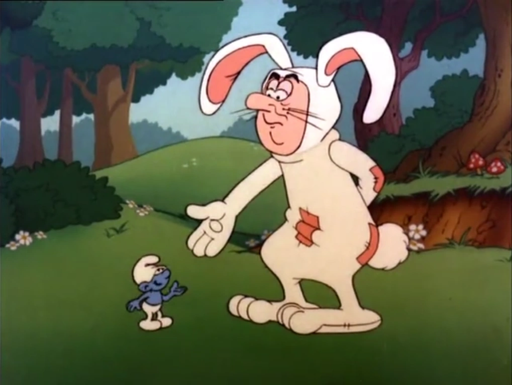 As Gargamel and Azrael hop out into the forest with their bunny costumes, Tailor is so busy dealing with the complaints of his fellow Smurfs with their costumes that he ends up telling them he quits and that they can make their own costumes. Out in the forest, Nat and Clumsy both split up in their search for bunnies, with Clumsy looking all over hither and yon until he comes across Gargamel and Azrael in their bunny costumes, apparently mistaking the two for actual bunnies. Clumsy asks Gargamel if he could pull the Smurfs' parade float the following day, and Gargamel says he would be honored, it would be "a golden opportunity". Clumsy then says that the parade starts at the edge of the smurfberry patch when the sun comes up (the latter part Clumsy has difficulty saying until Gargamel prompts him along), and Gargamel says he'll be there. After Clumsy heads back to the village to tell the other Smurfs about his fortune of finding a big bunny that talks, Gargamel says to Azrael that his plan is working, and the two hop off together with the evil wizard singing his song of what he'll do to the Smurfs.