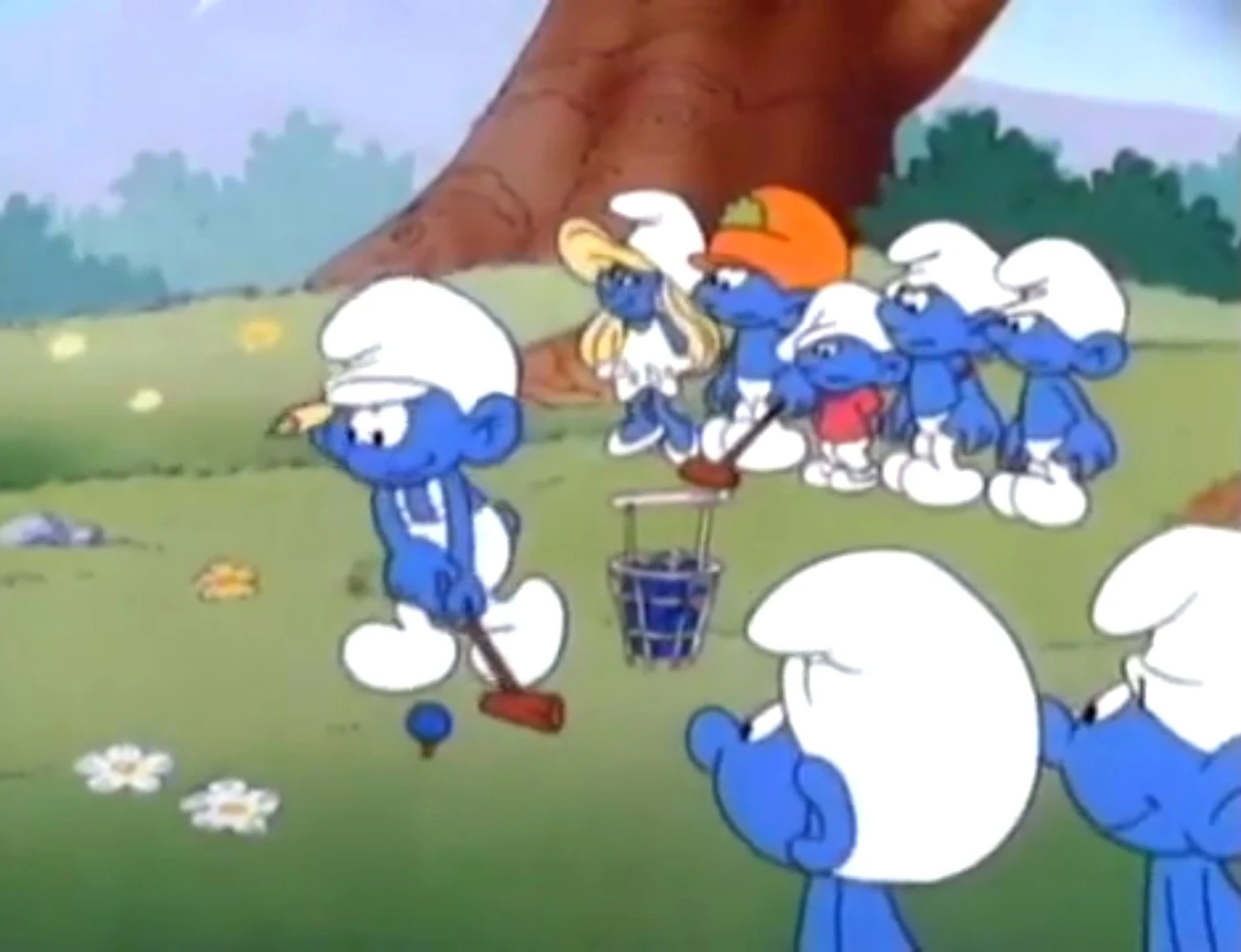 That same Smurf walks down a hill in the forest and starts hitting a stone with his stick, until the stone lands in a hole made by a gopher. He notices this and tries that again but misses. He is joined by two Smurfs that and say that it looks like he's having fun, so they join him in playing this newfound game. Handy, Hefty, Grouchy and Clumsy come past them pulling two wagons full of wood for bridge repairs and ask what they're doing. The Smurf addresses the game as gophery, which Clumsy and Hefty mishear and change into golf, while Handy offers to improve their equipment.