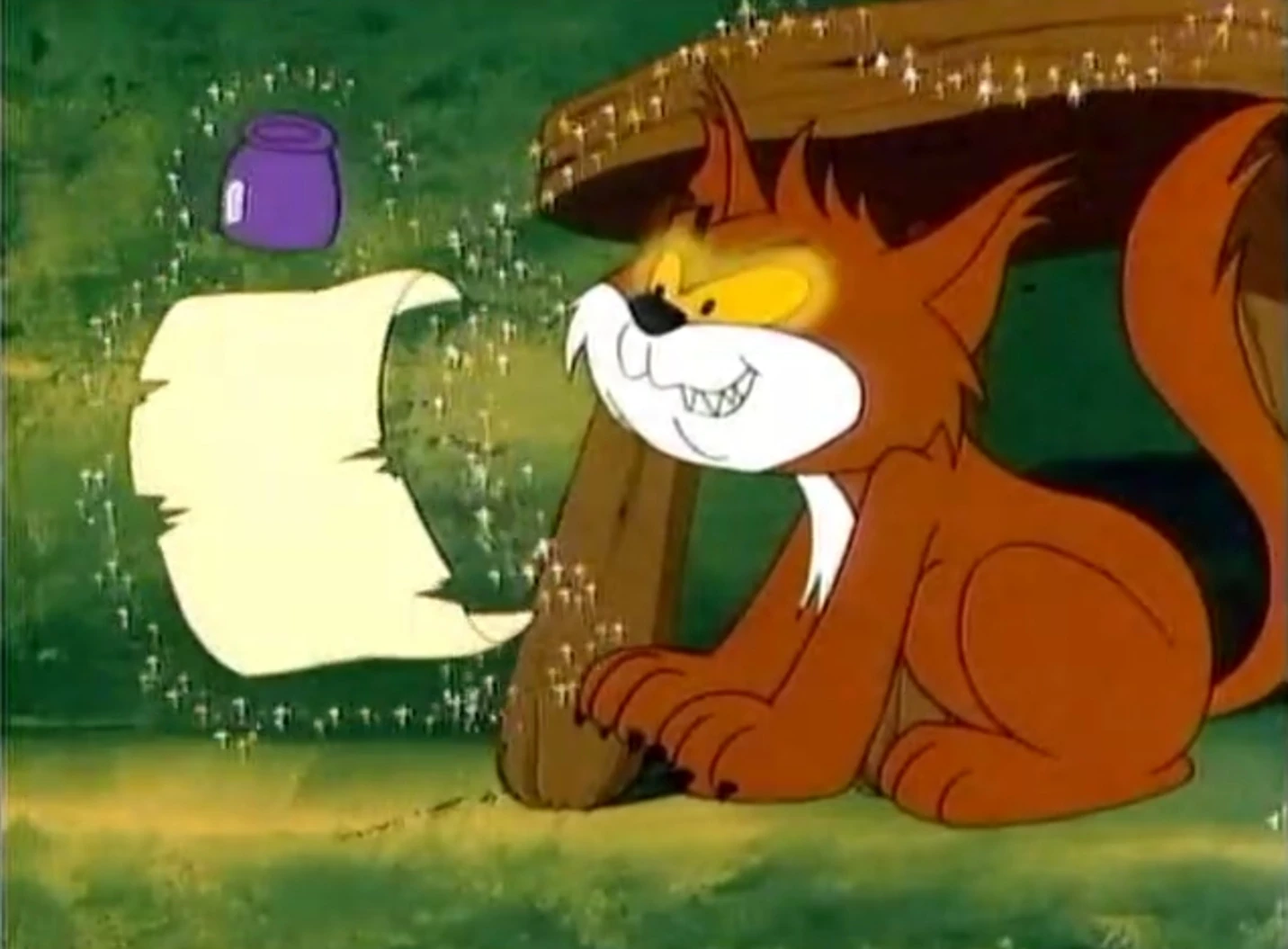 Azrael laughs out the Smurf song while he uses another piece of paper to show Gargamel something that he has just come up with: a Smurf catching machine. Gargamel thinks that the idea is brilliant and sees that his cat is now a genius thanks to his brain boosting formula, but as Scruple says that he wants to see Azrael try to build it, the cat makes tools come out of a chest and hands them over to Scruple, indicating that he's the one who's going to build the machine. Scruple objects to this, only to be swatted in the butt by a saw that Azrael controls with his paw, making him change his mind. Gargamel is pleased with how his cat is taking charge of deciding who gets to build the machine, saying why should the creator do all the work when he can get someone "dumber" than him to do it, and then Azrael has the tools handed over to Gargamel, suggesting that he's going to be the builder.