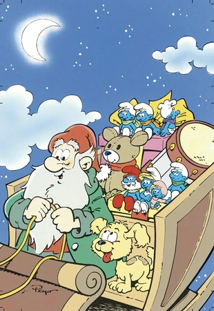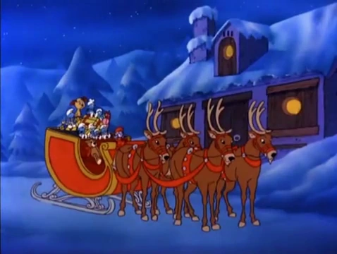 The Smurfs cheer as Nicholas' cheerful spirit has been restored, but now they face the problem of getting the presents delivered, and Nicholas now sees that his team of reindeer won't be able to finish by Christmas morning. But then Baby Smurf waves his hands, and soon Nicholas and the Smurfs see that the reindeer and the sleigh are both flying. The old toymaker is amazed by this miracle, and soon he and the Smurfs are now taking to the sky to make sure the children get their presents.