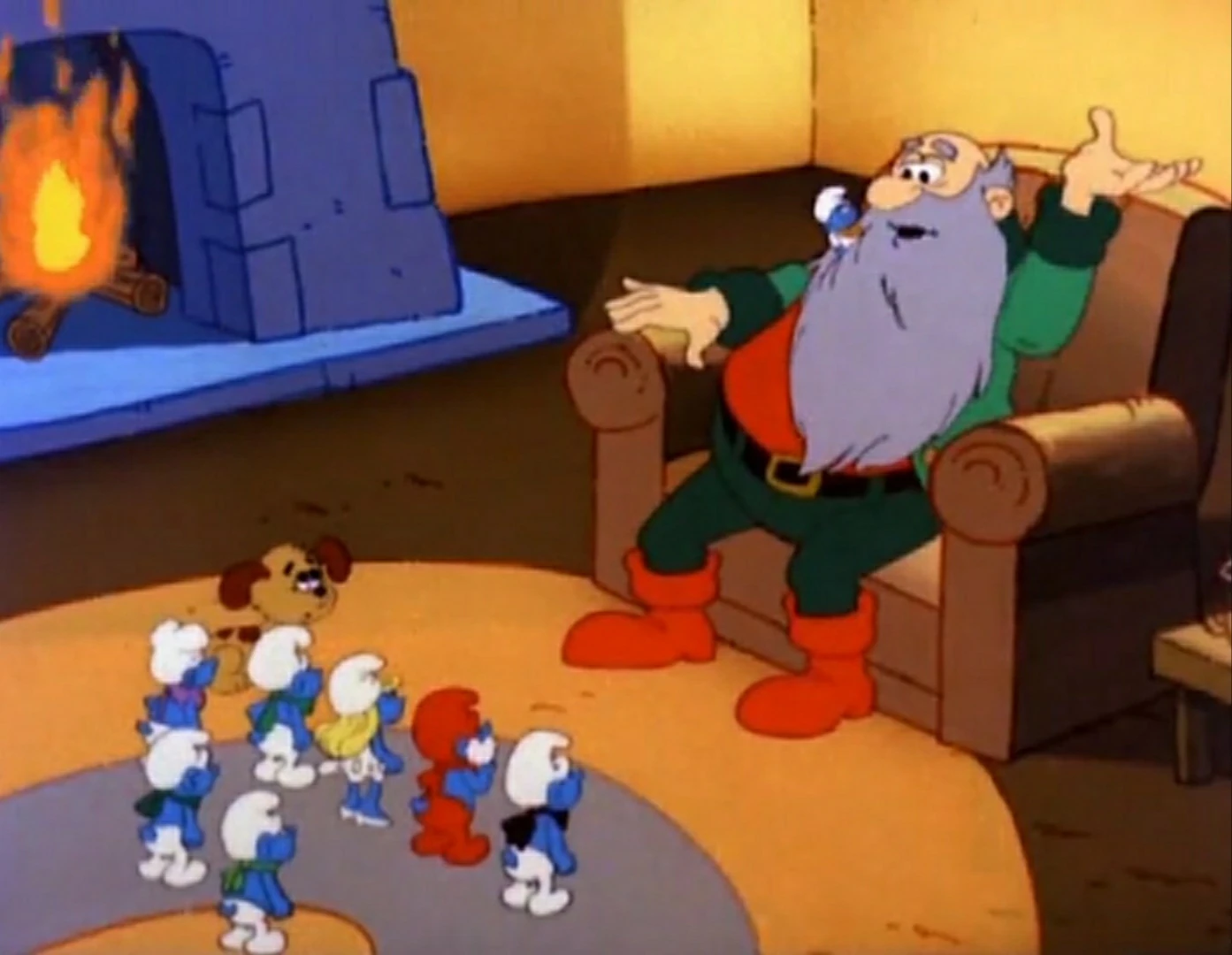 Dreamy sits high on a hill overlooking the village and sighs, saying that this is the time of the year when the whole world is filled with love and holiday cheer. Meanwhile, Gargamel is writing a letter to jolly old Nicholas the toymaker and gift bringer, asking him to bring six Smurfs for Christmas. He tells Azrael that he writes the same letters year after year, but he knows that someday Nicholas will answer one of them. As he goes outside to send off his letter, Gargamel finds a present outside his door, saying that every year he gets the same kind of present from the Smurfs, and that this time he's not going to fall for it. But as he tries to kick away the present, it explodes, causing Gargamel to lose one of his shoes. He is in tears hoping for Nicholas to fulfill his wish this Christmas.