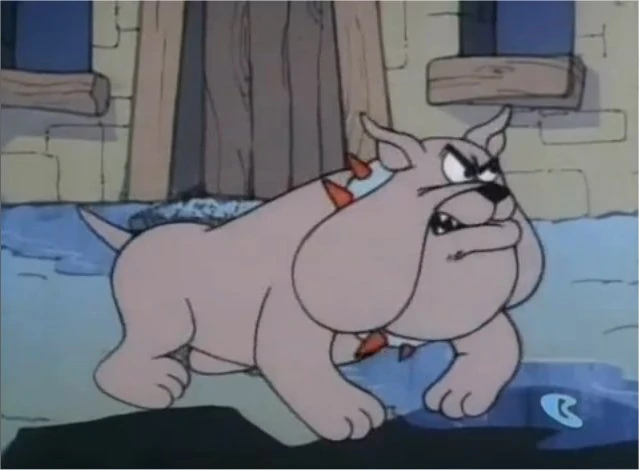 Bluster is a bulldog who appears in the cartoon show episode "Sideshow Smurfs". He travels around on a wagon with his master Bombast, who is very harsh toward his performers, including his dog, who was at one time Bombast's main star attraction.