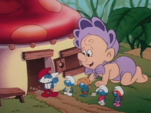 With the two ogres gone, the Smurflings now wonder what they're supposed to do as far as babysitting Bigfeet. They decide that they're going to rock the baby's cradle, and so they jump up and down on the cradle's runners operating it like a seesaw until they decide to go higher, and then they all get flipped off the cradle along with Bigfeet. The ogre baby awakens and sees "dolly", so he grabs Sassette and tries to cuddle her like a doll. Sassette tells the baby that she's a Smurfling and not a doll, which ends up making Bigfeet cry. They now wonder what's wrong with the baby, and Snappy thinks it's because Bigfeet doesn't have any toys to play with. Sassette suggests bringing Bigfeet into the village so he can play with their toys, and so the Smurflings have the ogre baby give them a ride back as he crawls his way to the Smurf Village.
