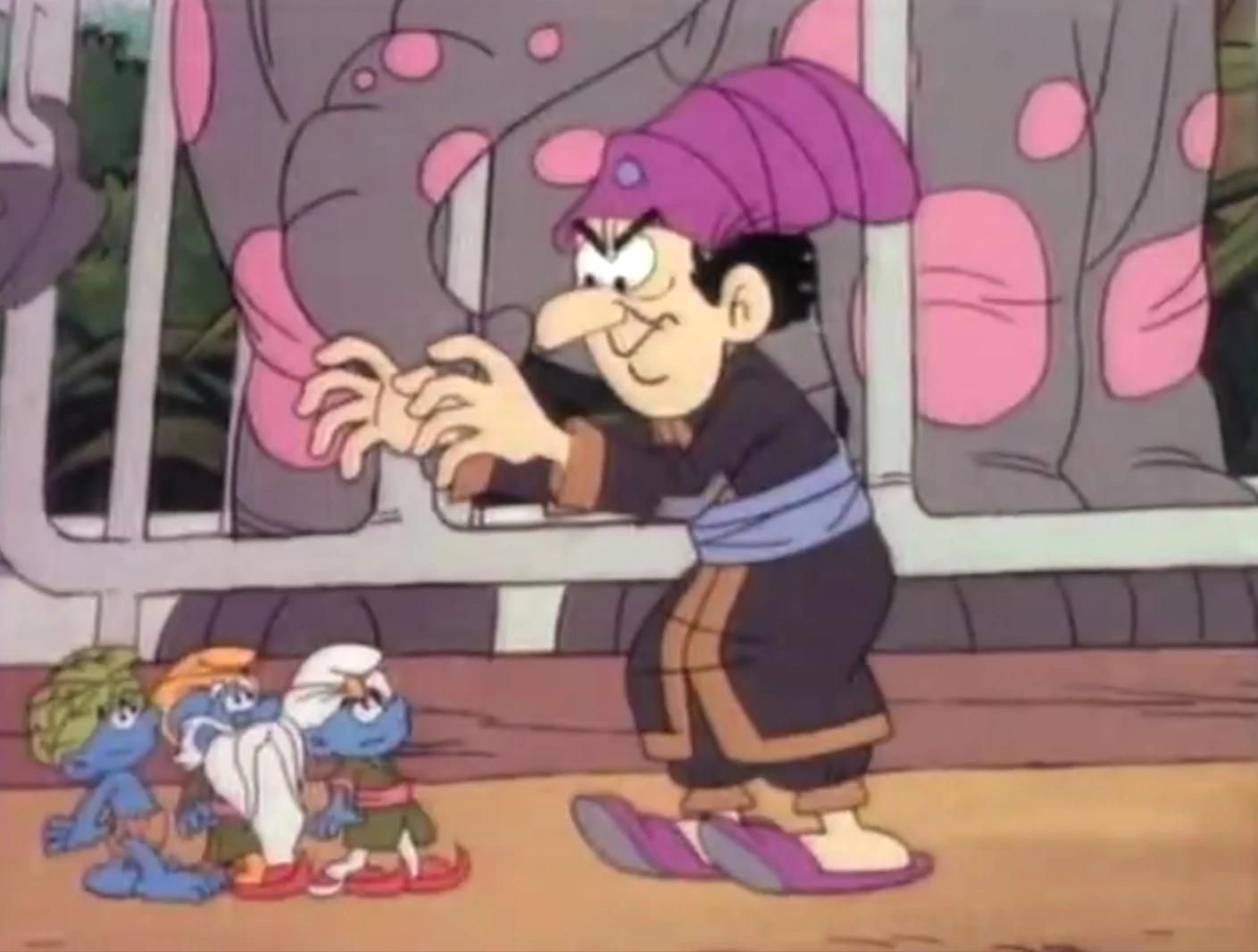 Meanwhile, the cart is slowing down and enters the Rajah's palace. Gargapuri gets off from the cart and checks his goods. Gargapuri is furious as he finds out that the 'horn' has come off from the dog's head. He paints some glue on the 'horn' again and places it back. He carries another cage which locks a monkey. Wears a white, furry coat to disguise as a strange creature. Wild is looking at this, seeing the animals being tortured, feeling angry at the moment. Meanwhile, Rajah arrives to meet him. Gargapuri first asks the six-leg pony that he sold to Rajah last time, the Rajah says nothing but removes the pony's two fake legs, showing Gargapuri that he had cheated him. Gargapuri tries to explain and give the new 'special' animals to Rajah. However, Rajah is cleverer this time as he calls his men to examine the animals. Wild leaves the cart at the moment to rescue the animals. He visits the trapped animals in Rajah's zoo, first a zebra, next a pair of tortoises, then an elephant. He tries to pull the cages and free the animals. Grandpa Smurf and Jokey come to see Wild, at the same time, they have been noticed by Gargapuri, Rajah, and Rajah's guards. The dog rushed to them, and the Smurfs run away. Back to Gargapuri, he is being asked by about the Smurfs, although he does not know anything about Smurfs, noticing a big chance of getting rich from Rajah, he pretends to know about them and catches the three Smurfs right away. Back to the Smurfs, they are hiding behind some bushes and escape from the dog, unluckily, they fail to get away from Gargapuri. The Smurfs run away again and Gargapuri chases at them, result as being stopped by Rajah's elephants. The elephant garbs Gargapuri up and tosses him away by its trunk. The Smurfs are running towards the cart, but they do not aware Rajah as he captures the Smurfs again. However, Gargapuri, who is being tossed up in the air at the moment, lands on Rajah and the Smurfs escapes in the mess. The Smurfs arrives at the cart, and they are going to leave. But the dog is still chasing at them. Grandpa Smurf uses his stick to stop the dog approaching. The stick hits the dog's head hard and its 'horn' flies away and hits the bulls which pull the cart. The cows are scared and run away, also pulling the cart and getting the Smurfs away from the palace. Seeing the Smurfs getting away, Rajah blames Gargapuri for letting the Smurfs escape. Gargapuri promises that he will catch them gain, thus asks Rajah about the payments of the white monkey and the dog with horns he introduces. However, the animals' disguise has been come off. Rajah is very angry at Gargapuri again and calls his men to kick Gargaprui away from his palace.