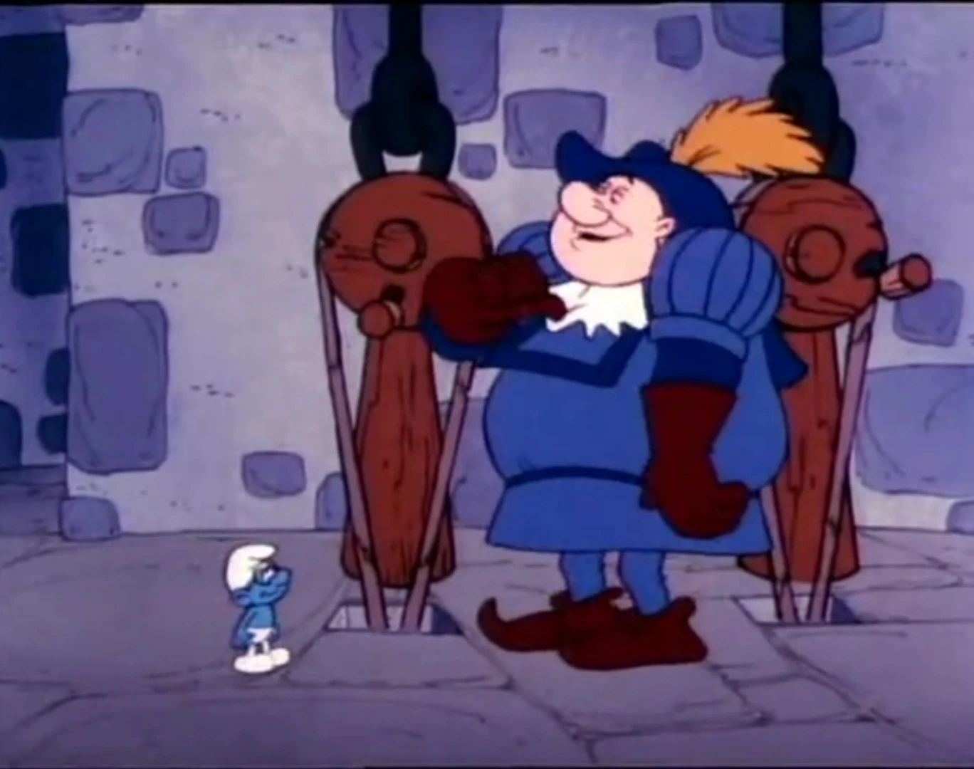 Papa Smurf: "I see, I see! Bignose! Please, Bigmouth, please! Perhaps the Smurfs can help!" Bigmouth: "How? Bignose say Bigmouth have no romance, no manners, no future!" Hefty: "No kidding!"