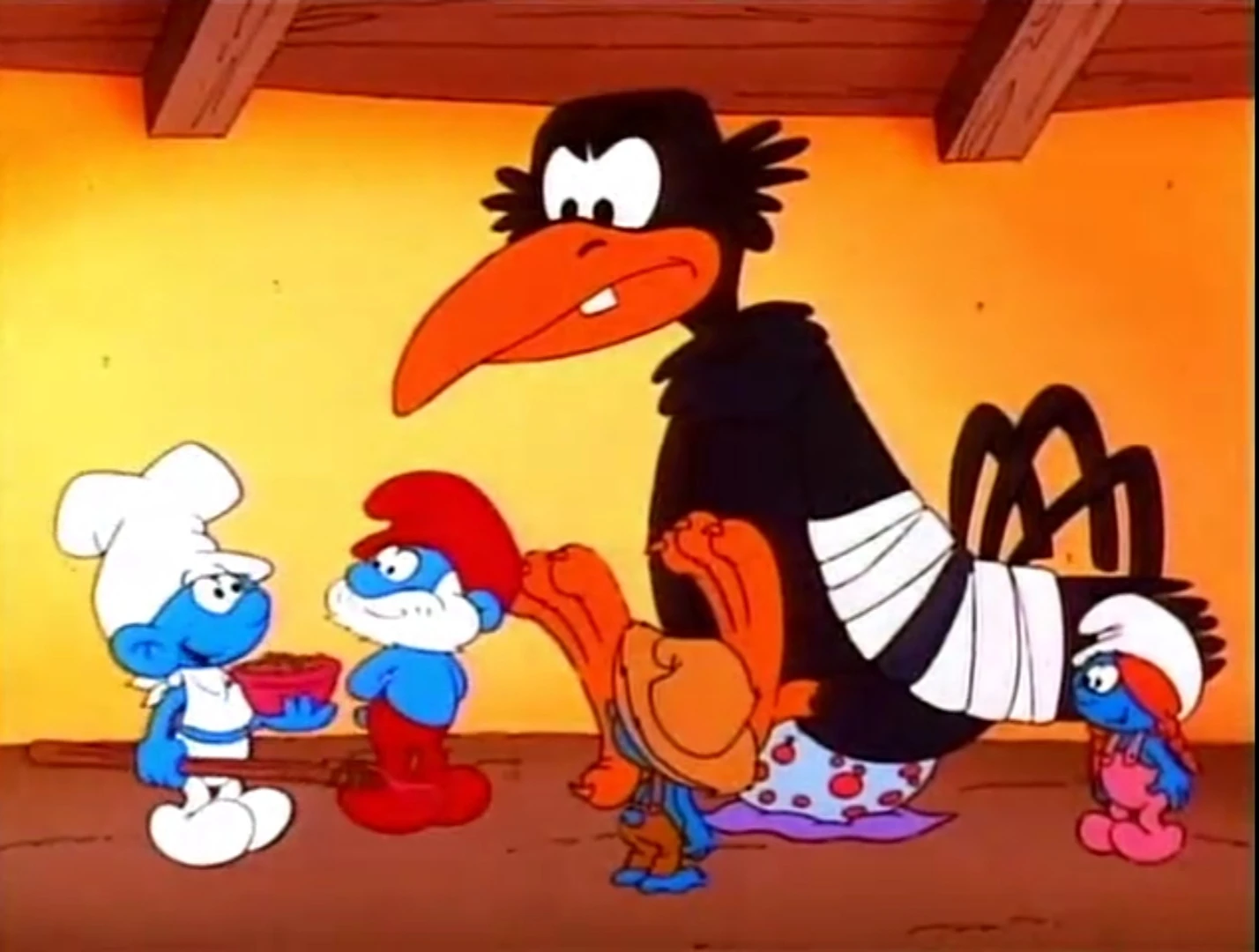 The Smurflings are taking care of an egg while Gargamel transforms into a bird. The Smurflings take Gargamel to the village , thinking he's the mother of a little bird.