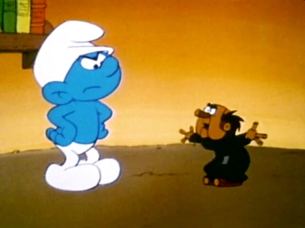 Alone with his dummy, Jokey tells him that it's all his fault. The dummy tells Jokey not to blame him, but rather Gargamel, for he is the one who gave the dummy life, and now he intends to destroy the Smurf Village. Jokey grabs the dummy and stuffs him in the cellar, locking the door with a bolt so that he can't get out. Jokey realizes that he has to prove his innocence in the matter and keep the village from being destroyed. As Gargamel goes looking for the village and the dummy tries to look for a way out of the cellar, Jokey disguises himself as the dummy so he can get into the evil wizard's lair and find the spell to make the evil puppet lifeless again. With nobody home, Jokey goes inside and looks through the spell book on Gargamel's table, but just as he finds the spell, Gargamel returns and notices the dummy, seeing that it's much bigger than before. Jokey slips out of the costume and grabs the page from the book as he makes a run for the village. Gargamel and Azrael pursue him, but Jokey quickly sidesteps and lets them both slide into a mud puddle to give them the slip.