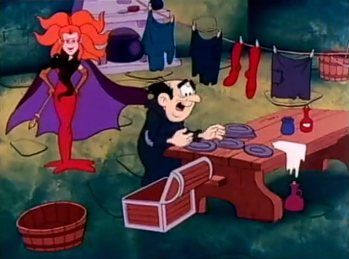 After the enchantress gets herself off Gargamel, she sends Scruple scurrying with a blast of her power for sassing her, which makes Gargamel so lovestruck by her wickedness that he's willing to offer whatever she wants, saying that he's a very rich wizard. The enchantress introduces herself as Evelyn and her pet weasel as Satin, and though she finds Gargamel's mispronounced name to be cute, she is less impressed by his living quarters. Gargamel says that it's only temporary and that he's the only wizard who knows the secret of the Philosopher's Stone, which requires the capture of six Smurfs. Evelyn has no idea what a Smurf is, but after Gargamel's explanation of who and what they are, she sends the wizard on his way to capture the Smurfs while she stays in his castle to steal his gold formula. Gargamel asks Evelyn if he could borrow the magic wand, and she allows him to do so, asking if he knows how to handle a wand. Gargamel tries to prove that he does, but her wand seems to have a mind of its own as it blasts the wizard in the foot.