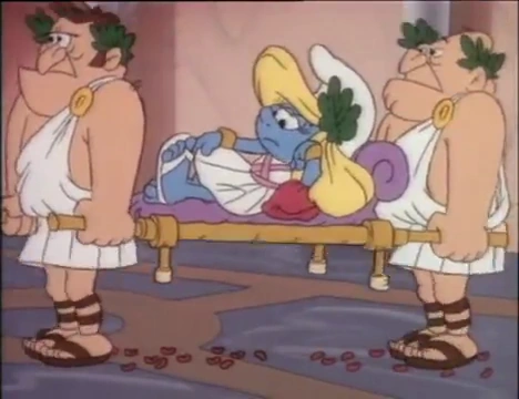 In the royal bath house, Julius Geezer is ready to take a dip in the water when Smurfette comes pouring out of the fountain head, splashing the emperor and his adviser. Julius wonders who dare to soak him when he sees Smurfette emerge from the water all wet and comments that she must be a gift from the gods. Sinus takes note that, among her many beautiful assets, Smurfette is truly a "blue blood" in that she's all blue. Julius decides that he's going to make Smurfette his son's bride, which makes her react all negatively in saying that she's not marrying anyone. Sinus tells the maiden Smurf that what Julius Geezer says is not a proposal but a command, a thought that makes her somewhat fearful.