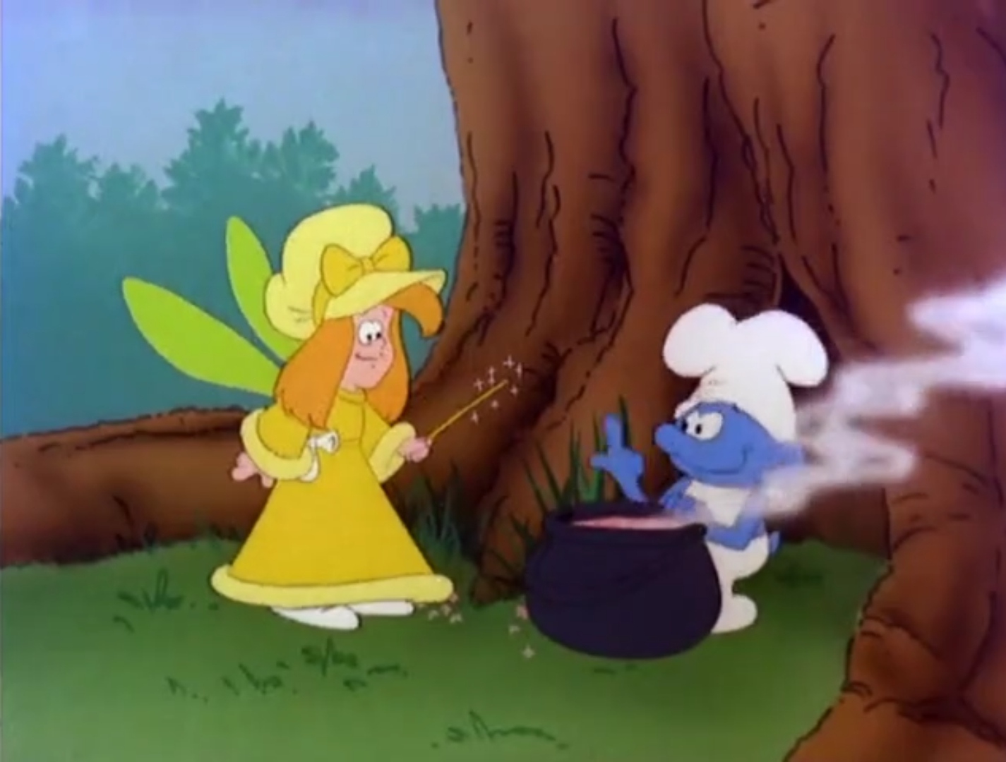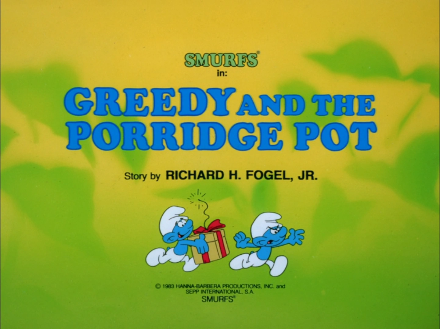 Out in the forest, the female fairy flies along humming merrily when she notices somebody left a bucket of berries behind. She goes over to pick it up, only to get caught in a trap laid out for an unsuspecting passerby her size. Then Greedy comes along, talking about how his pickle wheat Smurf cake will be the hit of the Feast, when he hears the fairy's cry for help and sees her in one of Gargamel's traps. The fairy introduces herself as Gunilda the good fairy, and after Greedy releases her from the trap, she offers to grant him one wish to thank him. After Gunilda says that her specialty is feeding the hungry, she gives him a tiny pot that she calls a magic porridge pot, which afterward with her magic wand makes it bigger. She tells Greedy that if he's ever hungry, all he has to say is, "little magic porridge pot, make some porridge nice and hot", and as Greedy watches, the pot automatically fills itself with nice hot delicious porridge, which she says the pot will make as much as he needs. Then Gunilda says that when Greedy is through, all he has to say is "little magic porridge pot, no more porridge, thanks a lot," and Greedy sees that it's empty. He is so amazed by the magic porridge pot; he couldn't wait to show it to his fellow Smurfs.