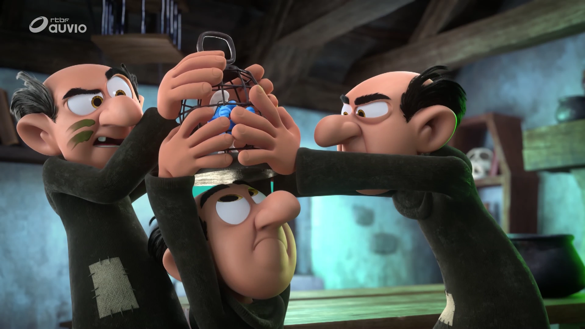Brainy is now in Gargamel's hovel with Gargamel locking him the cell. However, the kung-fu clone wants to use it for fighting practice while the nice one wants to cuddle it. The three Gargamels end up fighting over Brainy, who gets pushed around in the cell until he yells that he can decide which one of the Gargamels will use him. They begin piling on one another as Brainy tells them he will pick, using a game of Eeny Meeny Miny Moe.