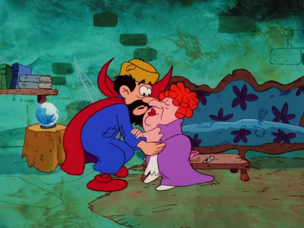 Realizing that part of his disguise is now gone, Gargamel takes the "magic whistle" and departs, still disgusted by the kisses Hogatha has given him. The Smurfs decide to depart before Gargamel uses the whistle. Back in her castle, Hogatha sees that Harlequin is now gone, but she feels certain that he will come back. She goes to her mirror, commenting about her being able to attract Harlequin with her charm, her beauty, and her beard... when she suddenly notices that "her beard" is "Harlequin's" stuck to her face. This makes her realize that he is really Gargamel, and this gets her so mad, she stomps on the fake beard, ready to do the same to the wizard once she finds him.