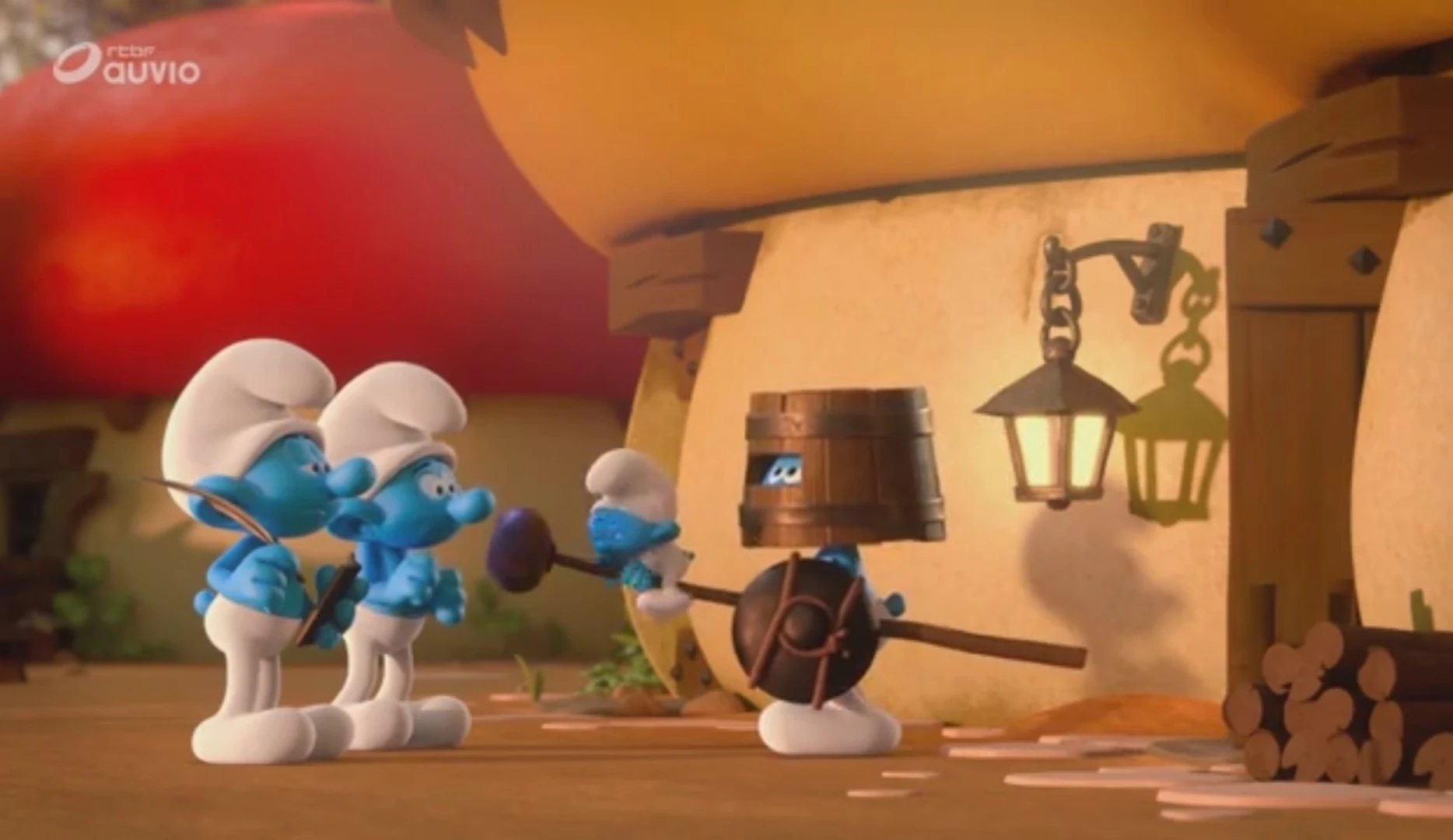 Later, Dreamer and Poet go around the village as they wake up Lazy and Dreamer asks Handy if he has seen any trouble around the village. Handy denies this and when the two Smurfs leave, Handy swings around loses balance on the ladder he was on. They also take Papa Smurf's bucket of potions as Poet refers to Papa Smurf as "Grandpa". Papa Smurf is bothered by this, and Dreamer tells him he's doing his duty as he puts the potions in his lab. Poet tells Dreamer that knights protect the village from danger. The knight Smurf decides to guard the Smurfs from "harm" but ends up causing harm as he attacks Handy's tools which he thinks is a monster due to the bucket he is wearing cutting off half his vision. Handy is mad at Dreamer, but he simply tells him there's nothing to worry about.
