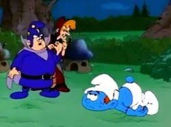 Meanwhile, Slouchy stops at the tree stump with a bag and thinks that hole in this stump will be nice for storing the old stuff and hides his bag inside. Then Gargamel comes and sees him. Gargamel jump to grab the little Smurfling, but Slouchy escapes from him. Then Gargamel finds Slouchy's bag and takes it to show it to the wizards.