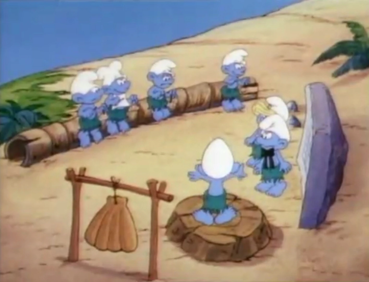 In one scene, Smurfette is dressed like the other Smurfs, just the grass skirt without the shells-bra.