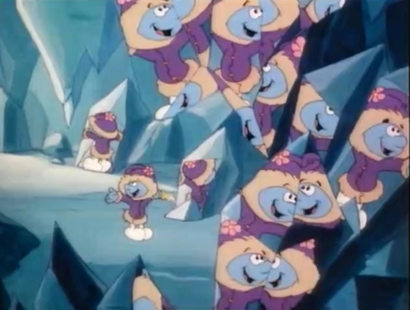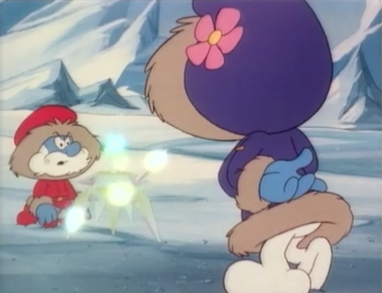 Vanity is still in the cave when he hears the others searching for him, so he grabs a crystal he thinks is the time crystal, but the cave almost collapses as he takes an ice crystal instead. He gets out and gives the crystal to Papa Smurf and apologizes while the icy ground starts breaking, so the Smurfs run back to the igloos.