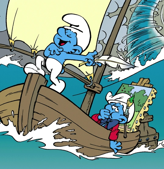 However, as the two Smurfs sail down the river, with Poet at the bow section composing "Ode To A River" and Painter in the aft section painting a picture of the river, neither of them are doing the steering of the boat. So, when the boat hits a log, the two creative Smurfs end up arguing about who's controlling the boat in addition to what each of them think of the other's creative work.
