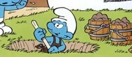 Potter (original French name Schtroumpf Potier) is a Smurf character who briefly appears in "The Smurfs And The Book That Tells Everything" digging another Smurf's garden, since the book that is the subject of the album told him he could find the best clay there. He only appears for three panels. He also appears in the story "Smurf & Turf" as the Smurf who fills in for Baker Smurf in bread baking while he's taking a vacation at Smurf Paradise, but as most of Potter's work is in baking pottery instead of bread, his breads turn out to be overcooked.