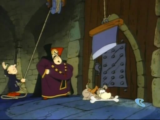 In Balthazar's castle, the evil godfather sorcerer tries to get the locket off of Puppy's collar but gets himself zapped by lightning. He then hands Gargamel a pair of scissors to cut the collar off Puppy, but he fares no better than Balthazar in trying to do so. Soon Balthazar decides to have Gargamel give Puppy the guillotine treatment, despite his godson's rather fearful reservations about Balthazar taking things a bit too far. Meanwhile, Papa Smurf, Handy, and Hefty reaches the tower of the evil sorcerer's castle and climbs down into a window where they see Gargamel ready to let the blade fall. As he does, Papa Smurf whistles to get Puppy's attention, turning him away from the falling blade, while Hefty and Handy jump onto the dog's back, ready to ride out of there. They climb up the stairs and jump out the window into the moat where Puppy swims them to shore. But as the moat's serpent is ready to eat them, Papa Smurf lets loose the drawbridge, knocking the serpent's head with it and sending him back into the moat. Balthazar tries to use his crossbow on Puppy and his passengers, but he is distracted by Gargamel, and his arrow misses. Papa Smurf then flies off with Feathers, telling Puppy and the other two Smurfs he'll see them back at the village.