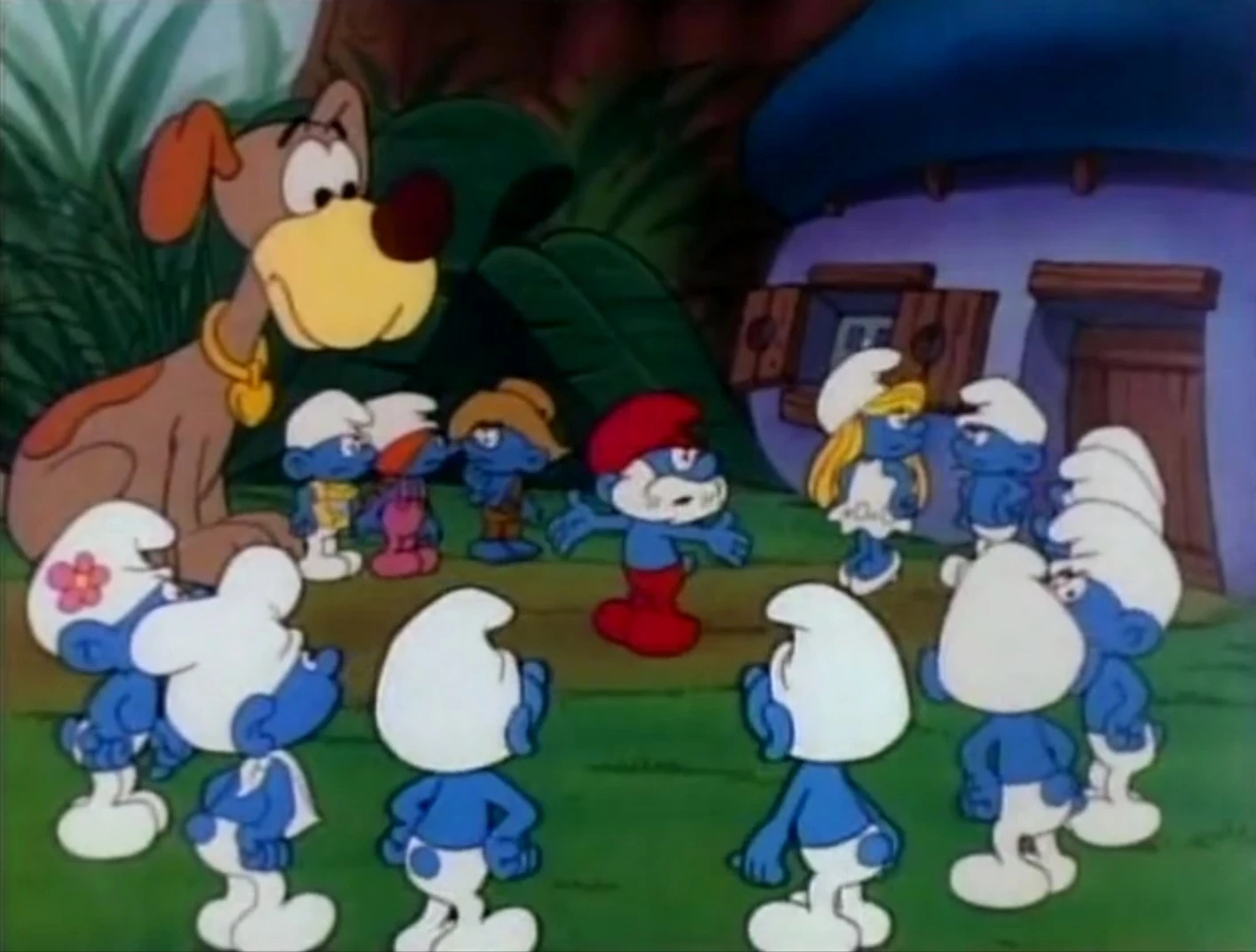 A townhall meeting is held where the Smurfs speak their anger over Puppy's recent behavior. Papa Smurf delivers an ultimatum: either Puppy learns to obey, or he's tied up outside the Village. Nat pleads to Papa Smurf saying he'll teach Puppy to be well-behaved. Papa Smurf agrees, albeit skeptically. Nat learns teaching Puppy to behave is harder than he though since Puppy is able to lick his 'reward cookies' out of Nat's hand. Brainy uses this as the opportunity to plug his latest book: Canine Training Tips. Just as the Smurflings are teaching Puppy to fetch, Puppy knocks Brainy over and fetches Brainy's book instead. Nearby Painter is watching Farmer in his smurfmelon farm to paint his latest masteurpiesa. But Puppy digs a hole in the farm causing smurfmelons to fly everywhere including on top of Farmer and through Painter's canvas. The Smurflings try running after Puppy to stop trouble, but it's too late. Painter tells Papa Smurf the whole story and shows him the wrecked canvas. Papa Smurf assumes Puppy is failing his training. Nat pleads that Puppy will improve, but Papa Smurf reminds the Smurflings there's lots of room for improvement as Puppy is burying Brainy's book.