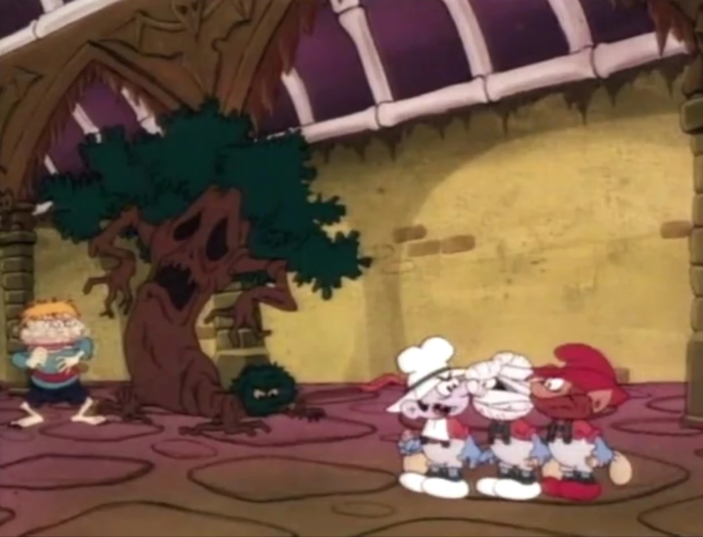 Grandpa Smurf sees Greedy and tells the other Smurfs to get him before he gets away, and as the monster Smurfs approach, Greedy turns and makes a run for it, stumbling into a patch of garlic during his escape. The Smurfs surround Greedy around the patch, but then they smell the garlic and react negatively to it. Their attention is turned to a strange foreboding castle on top of a hill and head off in that direction, following the sound of the music that Greedy is now hearing as he crawls out of the garlic patch. He ducks back into the patch when he thinks he sees more monsters coming toward him, but as it turns out, it is just Papa Smurf and Painter as their normal selves. Greedy tells Papa Smurf that the other Smurfs have turned into monsters, as in real monsters, because they couldn't stand the smell of his cookies.