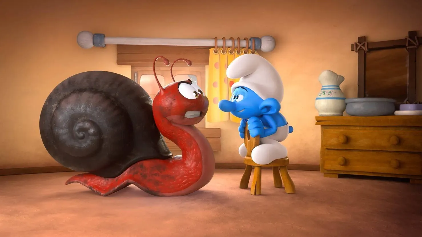 Dimwitty is in his house with the Gargamel snail. He calls him a "beautiful frog" and names him Fluffy. The Gargamel snail comments on this name, but Dimwitty overhears him, but he starts speaking gibberish, which he buys. Dimwitty decides to give the snail a massage. This massage, however, contains stretching out his neck and rubbing his head. The Gargamel snail notices Papa Smurf's lab, which is near his house. He tries to get out of the house via the window, but Dimwitty takes him back. He feeds him some leaves, saying he needs to get ready for the big race.