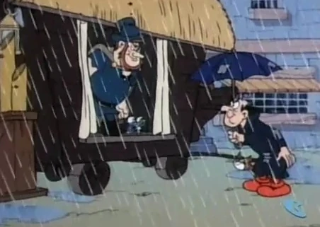 Then, rain starts to pour on the human village, and while it rains, Gargamel and Azrael are taking a walk through it, with Gargamel glad that such gloomy days keep the peasants away. However, Bombast is upset that it has to rain on his performance day because nobody will be out to watch it... and then he notices Gargamel walking through the village. Clumsy and Smurfette recognize the evil wizard as he in turn recognizes them on the show master's stage.
