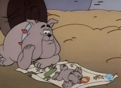 Then, they both hear something coming near the hole. Clumsy thinks it's Papa Smurf, but Smurfette says Papa Smurf doesn't growl. They look up to see the face of an angry dog looking down into the hole at the two Smurfs that are in it. Then as the dog tries to dig up his prey, a big man grabs the dog and pulls him away from the hole, asking if he's found a rabbit down a hole that he won't share with his master. The man reaches down into the hole and grabs the two Smurfs, wondering what these creatures are that he sees.