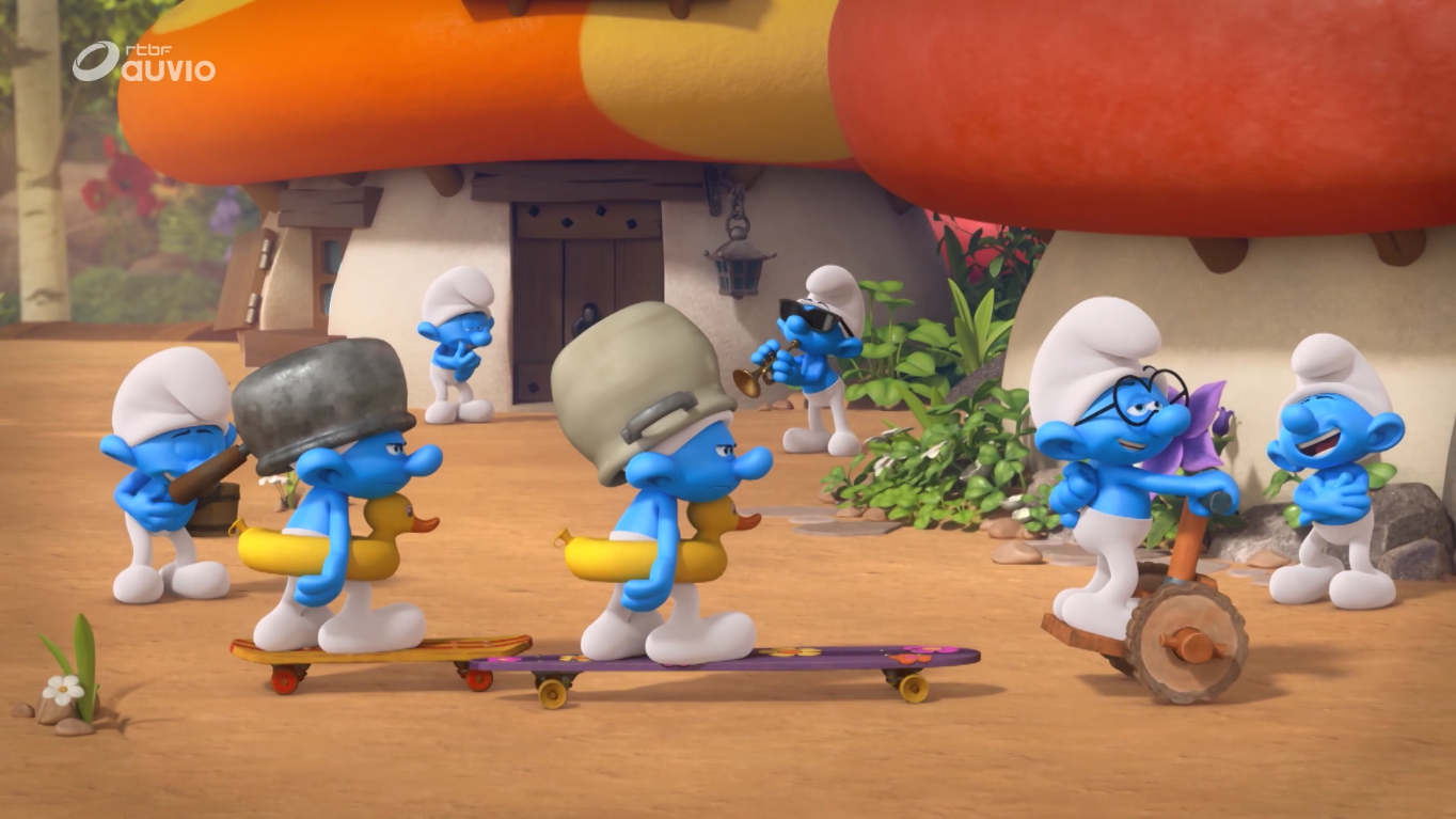 Jokey races around the village and passes by Farmer and another Smurf, both covering themselves as he passes. Vanity is racing as well, and he catches up with Jokey as they proceed to race across the village. Jokey uses his smurfboard to jump over a Smurf. The two catch up with each other once more and race until they see Brainy in the way, and they stop. Brainy asks what they are doing, to which they reply with "smurfboarding" and inform him that Handy made them. Brainy does not approve of this, saying they should return them right now, but the two don't want to listen to someone like him. They start smurfboarding again as Brainy angrily watches them.