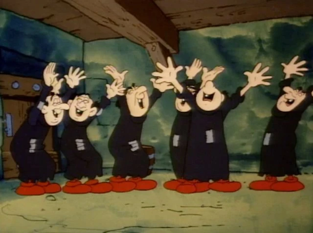 Back at the picnic, Papa Smurf is resting on a blanket with Baby Smurf when Smurfette, Hefty, and Handy wake him up, alerting him to the fact that they haven't seen Brainy. Papa Smurf assumes that Brainy is still looking for them, but Smurfette says he's been gone for too long and that he could have found them by now. Papa Smurf says that they'll just have to go out and look for him. In the meantime, Gargamel has to deal with six Brainys that are just as annoying as the original as they argue over how they're going to escape. But as Azrael is watching the cage to make sure the captive Smurfs don't escape while Gargamel goes to get more sea serpent slime, three of the Brainys taunt the cat, causing him to knock down the cage, which breaks apart upon landing. The six Brainys briefly argue over which direction they should go to escape when they finally decide going anywhere is better than being a sitting duck for Gargamel and Azrael.