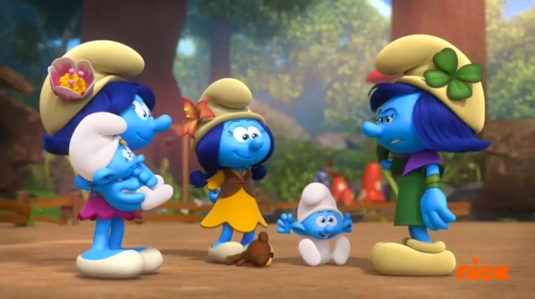 Blossom and Lily have arrived in the village and are taking care of the babies as Storm wakes up. She thanks them for coming, as it's a nightmare taking care of them. Blossom tells Storm that babies are easy to take care of and that she has read about them, but Storm gives her an unimpressed look. Lily tells Blossom to keep things simple. Storm tells them as long as they don't bother her, she's fine. She also says not to let them out of their sight especially Papa Smurf, who blows a raspberry at her.