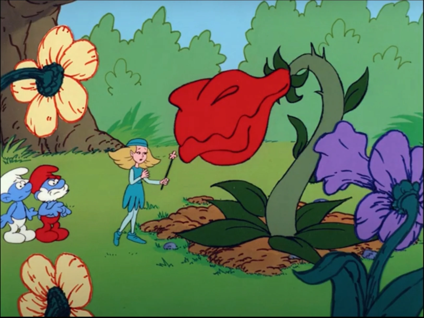 Out in the forest, Papa Smurf and Nat meet up with Laconia, who silently tells her friends that one of her butterflies has broken its wing. She brings them to the injured butterfly, to whom Nat promises that he will have it up and flying in no time. Meanwhile, Chlorhydris rides back out into the forest with her driver, bringing along an elf-eating snapdragon seed that she hopes to plant into the ground to capture Laconia. Eager to please his mistress, Reeves digs a deep enough hole in the ground for the seed to take root, though he splatters her face with dirt. After planting the seed in the ground, Chlorhydris places a spell on the seed so that it will grow and become the plant she desires it to be.