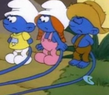 As Brainy is busy brewing up the formula for the tattle-tale spell, the Smurflings catch him through the window, with three of them saying they're going to tell Papa Smurf. Slouchy again warns his fellow Smurflings that it isn't smurfy to tattletale. But Brainy encourages the Smurflings to tattletale all they want, and so three of the Smurflings did... and as they do, their tails start to grow. When this revelation becomes apparent to the three Smurflings, Brainy smugly says, "why do you think they call it a 'tattle-tail'?", and that the more they tattle-tale, the more their tails grow. Soon, the tattle tailing Smurflings turn on each other, and this makes their tails grow longer and longer. In fact, Snappy's tail grows so long that he gets dragged into Handy's automatic clothes washing machine, ultimately wrecking it. Handy tells Snappy that he hopes he has a good explanation for it, and Snappy says it was Brainy's fault... which causes his tail to grow longer. Slouchy just calmly says it's not good to tattletale.