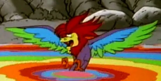 While Grandpa takes Painter, Puppy, and the Smurflings up the mountain path to the Rainbow Pool, Gargamel spots them with his binoculars and goes after them. After a seemingly grueling hike up the mountain, the Smurfs see a pool that is so full of various shades of colors, all being fed by a waterfall full of liquid made of the same colors. Grandpa Smurf sees that this must be the Rainbow Pool, a sight which amazes both Painter and the Smurflings with its brilliance. Slouchy, however, wonders about "the rock" they're supposed to look for as Grandpa Smurf dips an empty bottle into the water, but just as he does, a variegated fearsome creature with wings arises from the center of the pool. Grandpa Smurf says that this must be the Roc, a creature from the ancient past, which makes him and the younger Smurfs run for their lives.
