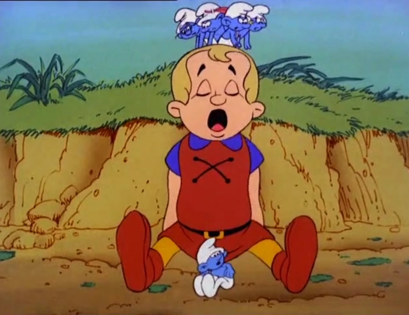 The next day, the Smurfs are pulling a wagon of logs to the dam in order to repair it. Handy says that they're going to need a lot more wood to fix the dam, and Hefty says there's probably more on the other side of a yellow hill he was just pointing to. Clumsy doesn't remember ever seeing that hill before, and as the Smurfs check it out by standing upon it, they feel the hill moving and they also hear it snoring. Clumsy slips off the hill and sees that the hill is attached to a very big boy who is sleeping. Then the boy sneezes and the Smurfs also fall off what was the boy's head, with the boy waking up and wondering who the little blue men he sees are.