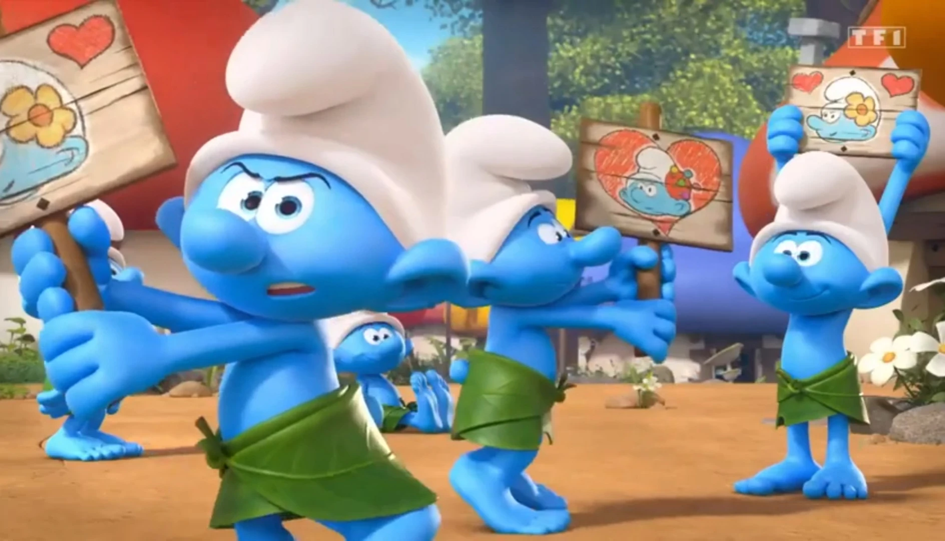 On Tailor's side are: Grouchy, Curious, Lazy, Glammy, and other unnamed Smurfs.