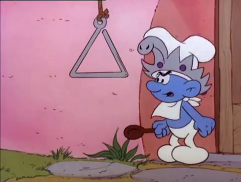 As the story begins, Greedy is ringing the triangle outside his kitchen to signal his fellow Smurfs that the meal is ready. They all gather outside around the dining table as Greedy serves them hot soup and biscuits, which all the Smurfs enjoy. Handy says that Greedy is the hardest-working Smurf of all, and Hefty tries to calculate how many portions of meals Greedy has to make for 101 Smurfs three times a day before just simply giving up and saying that it's a lot of meals. Greedy says that he enjoys serving his fellow Smurfs almost as much as he enjoys serving himself.
