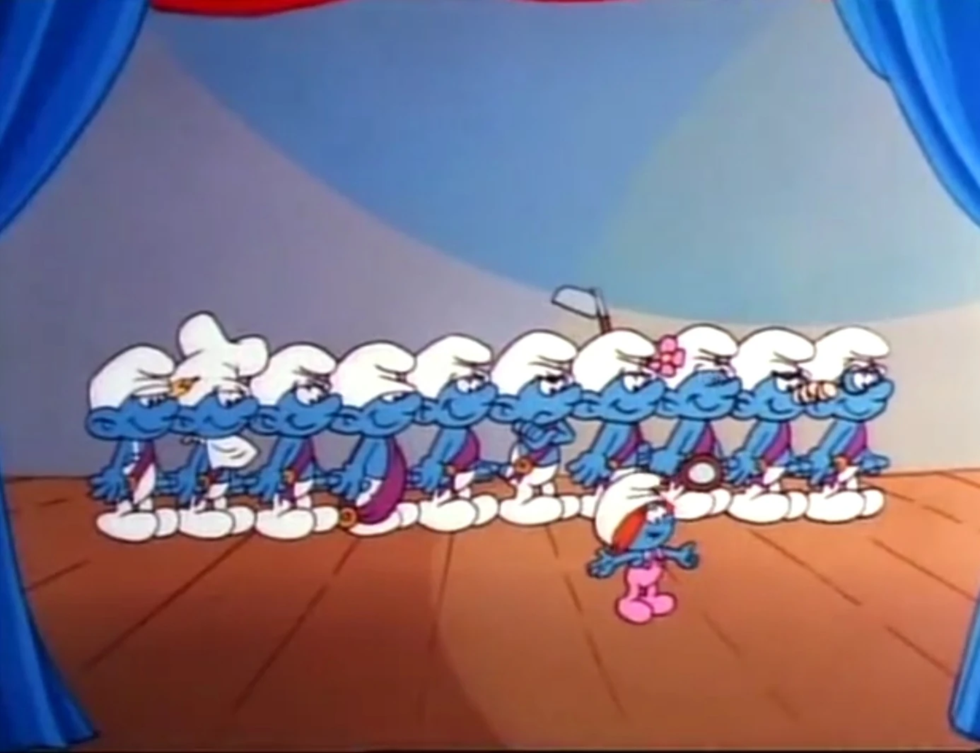 Soon, every Smurf is gathered around the Smurf Theater, waiting for the contest pageant to start. Smurfette is wondering about Sassette having her wear a judge's gown, while the Smurfs in the contest are making final preparations for their appearance on stage. Vanity is warming up his voice (for his song-and-dance routine) by running through the solfège, on the Mi note. He swoons and says how that word delights him so ("Me"). Clumsy is nervous about who's going to win, while Hefty tells Clumsy that he doesn't get nervous when he knows who's going to win. Grouchy mutters that he hates knowing who's going to win... before letting off a brief chuckle that assumes it's going to be him! Greedy brings the room's attention to him by boasting that Smurfette was paying attention to him at the dinner last night. The other Smurfs scowl at him in jealousy and contempt. Vanity steps in to tell Greedy the only reason Smurfette was staring at him was because he was talking with his mouth full. Gargamel, away in the corner, says that soon his mouth will be full of Smurfs!