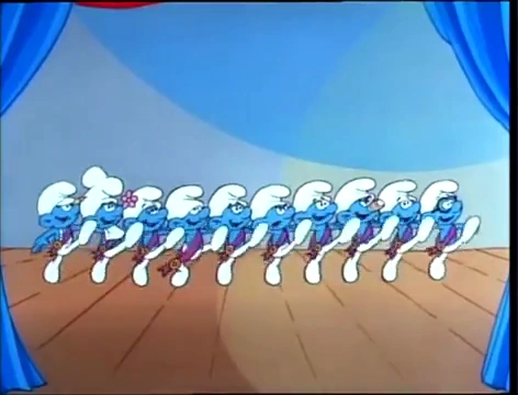 The next part of the contest was a group singalong that all the contestants participate in, singing to be the one that Smurfette will choose to take her to the ball, after which Gargamel says to himself that he's going to be sick. Following this comes the talent part of the contest, with Greedy being the first act. Sassette says that he will make a table of goodies disappear... and when he pulls the tablecloths, he does make them disappear, right into his mouth! Vanity does a song and dance routine of his own, all dressed up in a suit and tie while looking at his reflection. Clumsy does a unicycle act, which ends up with him cycling himself off the stage and out beyond the village limits. Sassette next introduces "Nosey Smurf and his imitation of Gargamel", and behind the curtains, Gargamel is cursing the Smurf pushing him onto the stage, where he finds himself embarrassed to be the center of attention. As every Smurf claps at the "impersonation", Papa Smurf comments that it certainly sounds realistic. The next acts include Farmer's trained worms, Handy's musical nails, and Grouchy with his "thousand faces" which are all variations of the same face he usually wears.
