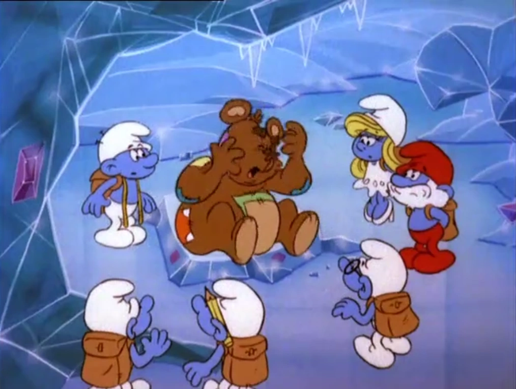 Suddenly, they hear a moaning, as if somebody in this frozen world is crying. They see that it's coming from a patched-up toy bear that's crying his eyes out. Smurfette feels her heart going out to the bear, and Papa Smurf approaches the bear to comfort him. The bear calls himself Patchwork, the guardian of the Emerald Empress in the crystal kingdom and says that an evil being named Crackle had imprisoned the empress and had frozen the entire kingdom with a magic crystal, and the only thing he could do was run away like a coward. Smurfette tries to soothe the crying bear by saying he was only trying to get help and he has found it. Papa Smurf offers to give the help and tells the other Smurfs that they will need to set up camp. As they go off with the bear, Brainy has a few words with Clumsy, saying that the bear will give them nothing but an ounce of trouble.