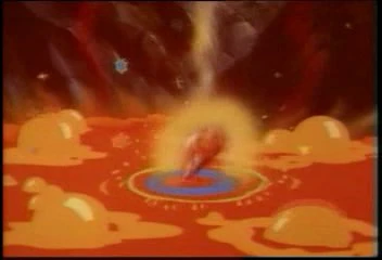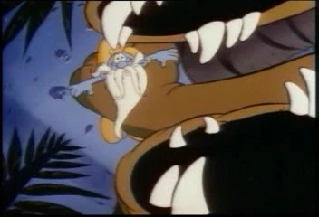 The Smurfs flee for safety as the big dinosaur attempts to eat Grandpa, but Snappy gets daring and tries to use a fire stick to give this lizard a hot foot when he gets knocked over to where he finds Crinkles again, happy to see him. Some Smurfs launch fire sticks at the big dinosaur, who easily swats them away before stepping on their catapult, sending them fleeing. Soon, Smurfette, Sassette, and Baby Smurf are trapped by the big dinosaur's tail, and he's ready to have them for dinner when Crinkles appears again with Snappy. He runs right under the big dinosaur, causing him to flip over and loose Grandpa from his grip, letting some other Smurfs catch him. They ask Grandpa if he's all right, but he's less concerned about himself and more about the key that's still dangling over the lava pit.