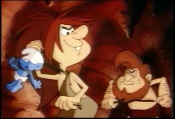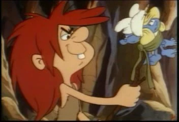Meanwhile, Brainy, Handy, and Smurfette sneak their way into the caveman community using a bush for cover while following the human tracks to a cave he supposedly took Clumsy into, when they run into Grog's sabretooth cat, who stops them in their tracks. Grog, still relaxing, hears a cry outside, and sees his pet bring in a bush with three more "blue lizards". He tells his cat that he can eat the other three when Clumsy tells Grog that he will show him how to cook if he lets the other three go. Clumsy then demonstrates with a single bog berry still left on a branch, which Grog tastes and makes him decide that he won't let his cat eat the three Smurfs raw, but rather cook them. The nearby fire lets off some sparks, some of which burn away at Clumsy's vine leash, which frees him only to find himself chased by Grog and his cat. Smurfette, still bound with Brainy and Handy, tells Clumsy to run and get some help.