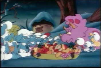 Snappy starts playing fetch with the dinosaur that he now calls Crinkles, sending him throughout the village to chase the ball, but also causing him to damage various Smurf houses along the way, including Greedy's kitchen, where he is busy cooking up a pot of chili. But later on, the playing around begins to exhaust Crinkles, so Snappy turns to Papa Smurf for his help, and he suggests that maybe he needs something to eat. Unfortunately, even with all the food the Smurfs manage to put in a giant bowl for Crinkles, the dinosaur doesn't seem too hungry for it. Grandpa Smurf tells Snappy that the dinosaur needs to be home with his own kind, munching on prehistoric plants. This inspires Papa Smurf to call upon the only being who can send Crinkles back to his own time -- Father Time.