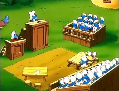Soon, the trial had been set in, with Greedy as his honor and Brainy as the judge. As Clumsy couldn't know what to do, Smurfette and Sassette tries to comfort their friend. While Snappy has to carry 12 volumes of Brainy's trial tips books for him, the trail soon has begun.