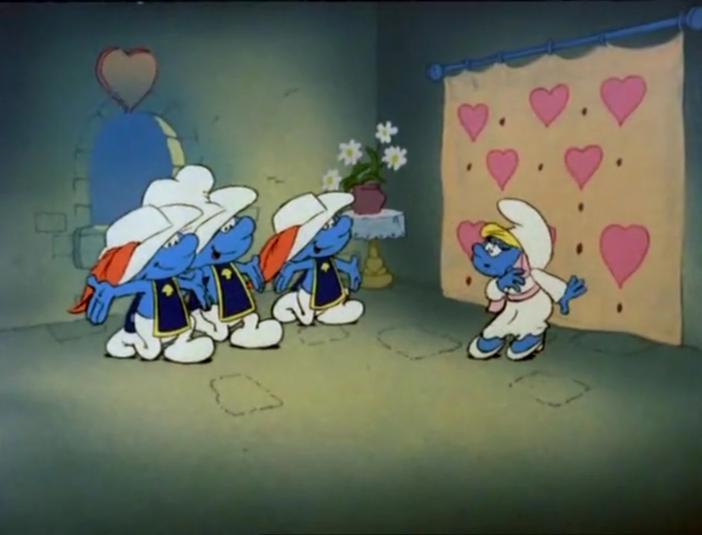 As Clumsy ponders what he's going to do, Smurfette at this point is dreamily thinking about Clumsy when Baron Smurfington enters her bedchamber and tells her that she's going to marry Prince Scaredy tomorrow. She soundly refuses to marry the prince, saying that she's met a Smurfingham, whom she truly loves. Baron Smurfington rages at the thought of his daughter marrying a Smurfingham and tells her that she will either marry Prince Scaredy or she will marry nobody. Smurfette weeps, wondering what she's going to do, when the Three Smurfketeers pay her a visit, with Jokey offering her one of his "surprises". Hefty tosses the "surprise" out the window, where it lands for Baron Smurfington to open, while Smurfette explains her situation to all three Smurfketeers. She asks them if they could deliver a message to Clumsy, and Hefty promises that they will, and as the Smurfketeers leave, Smurfette tells them to bring Clumsy before the wedding.