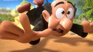 Elsewhere, Gargamel and Azrael make their way back to the hovel, where Azrael laughs at the bug Gargamel until he changes from a flower to a mushroom, to a walnut, to a pumpkin, to himself, which causes him to topple of the hill!