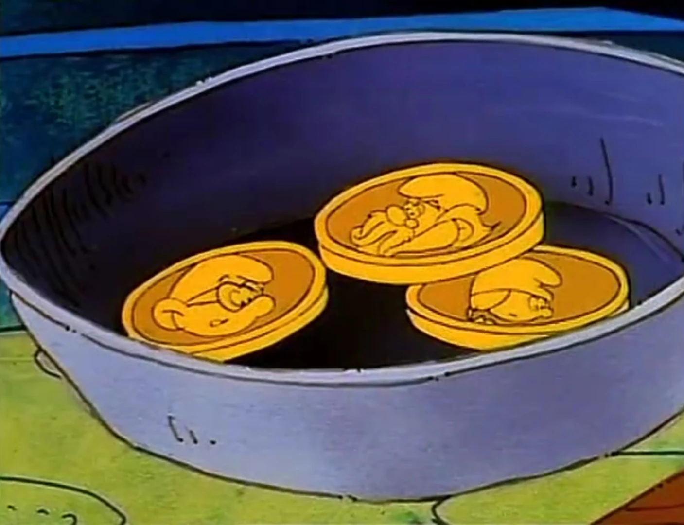Gargamel turns Sassette , Grandpa , and Brainy into gold coins. But because the transformation wasn't complete, they are able to turn back into Smurfs . Later, two robbers steal them and take them to the city.